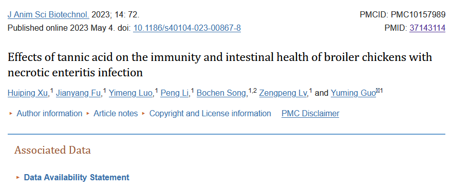 Results Challenged birds showed significant reduction in body weight, villus height, and the ratio of villus height to crypt depth (P < 0.05) and increase in the feed consumption gain ratio, intestinal lesion score, and crypt depth(P < 0.05). The infection significantly reduced the relative Bacteroidota and Ligilactobacillus abundance (P < 0.05) and increased the ratio of Firmicutes/Bacteroidota and cecal content of C. perfringens (P < 0.05). Challenged birds fed diets supplemented with tannic acid showed significantly increased mRNA expression of nutrient transport carriers and intestinal barrier genes and growth performance and reduced serum zonulin and endotoxin levels (P < 0.05). Addi-tion of tannic acid to the diet inhibited the inflammatory response by reducing the number of coccidia oocysts in feces and the content of C. perfringens in the cecum. Specifically, tannic acid reduced the serum levels of C reactive protein, myeloperoxidase, and specific IgY and ileal mucosal secretory immunoglobulin A levels in the ileal mucosa compared with those in the NE-infected birds. NE-infected birds fed diets supplemented with tannic acid also showed significantly increased relative Anaerocolumna, Thermoanaerobacterium, and Thermosinus abundance (P < 0.05); their microbial composition and functional predictions were similar to those of the NC group.