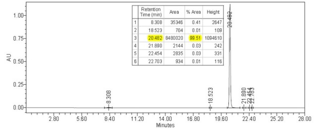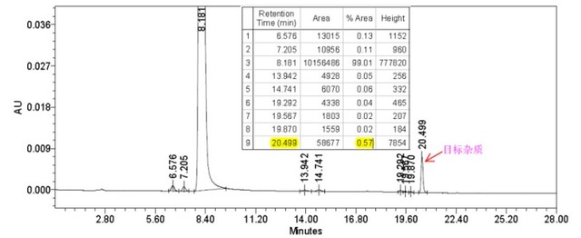 此圖為某原料藥純度檢測圖譜,要求:對 tR=20.49 min 的一個主要雜質峰進行研究,首先通過制備分離到較純的雜質單體(純度要求>98.5%), 再進行結構解析。