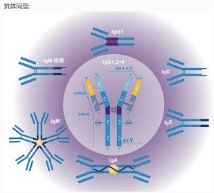 抗體按照其重鏈的不同可以分為五種:IgA、IgD、IgE、IgG、IgM,各類抗體的功能各不相同。其中IgG可以通過胎盤進入嬰兒血液中,為嬰兒提供天然的被動免疫,所以嬰兒雖然嬌弱,但是媽媽的抗體可以保護他們。而免疫球蛋白中的IgA可以穿過黏膜,是黏膜局部抗感染的主要因素。